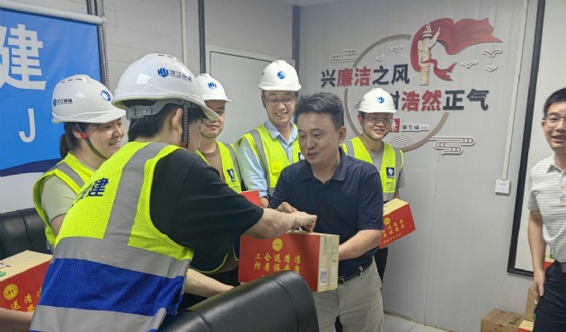 8月9日下午,襄阳市总工会副主席孙俊峰一行来到襄阳技师学院二期工程开展“夏日送清凉”慰问活动,对在高温下坚守岗位