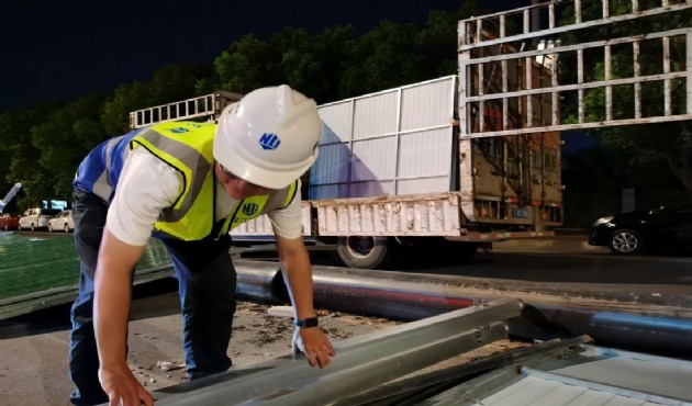 2024年8月2日夜,在名城路上,一处繁忙的施工工地灯火通明,交安公司员工正加班加点拆除围挡,为城市交通便利默默付出。拆除围挡