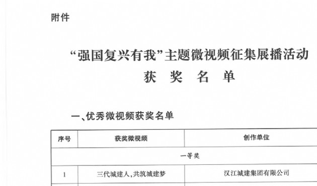 喜报!汉江城建荣获“强国复兴有我”主题微视频征集展播活动一等奖