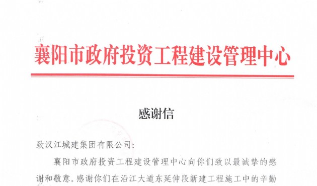 近日,襄阳市政府投资工程建设管理中心作为沿江大道东延伸段新建工程业主单位送来感谢信,对我司在沿江大道东延伸段新建工程施工