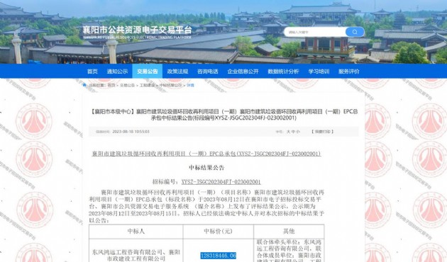2023年8月18日,襄阳市政建设工程有限公司成功中标襄阳市建筑垃圾循环回收再利用项目(一期)EPC总承包工程(以下简称“本项