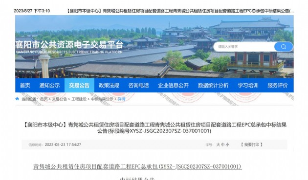 汉江城建中标青隽城公共租赁住房项目配套道路工程EPC总承包项目