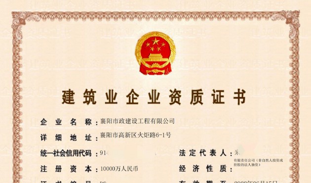 6月19日,经湖北省住房和城乡建设厅核准,市政公司申报的建筑工程施工总承包贰级、市政公用工程施工总承包贰级、隧道工程专业承包