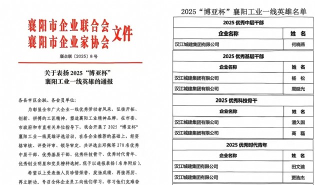 近日,从襄阳市企业联合会传来喜讯,在2025“博亚杯”襄阳工业一线英雄评选活动中,汉江城建9名干部职工凭借突出表现,