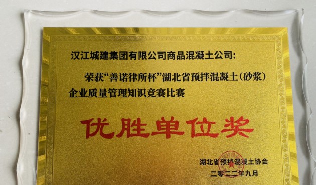 近日,汉江城建商品混凝土公司在湖北省预拌混凝土协会举办的2022年“善诺律所杯”湖北省预拌混凝土(砂浆)企业质量管