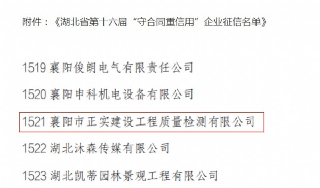 近日,襄阳市正实建设工程质量检测公司顺利通过湖北省市场监督管理局评审,荣获“湖北省守合同重信用企业”称号。&ldq