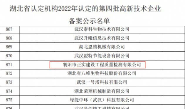近日,汉江城建的全资子公司襄阳市正实建设工程质量检测有限公司正式通过了国家高新技术企业认证,凭借专业的研发队伍,雄厚的技