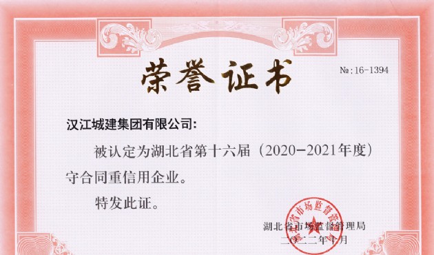 近日,汉江城建荣获由湖北省市场监督管理局颁发的第十六届(2020-2021年度)“守合同重信用”企业称号。此项荣誉的获得