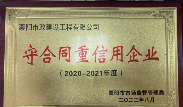 近日,襄阳市政建设工程有限公司凭借良好市场信誉与优质服务获2020-2021年度襄阳市“守合同重信用”企业,这是自公司改