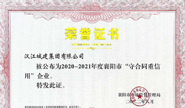 近日,襄阳市市场监督管理局正式公布2020-2021年襄阳市“守合同重信用企业”名单,汉江城建秉承诚信经营的企业理念,守