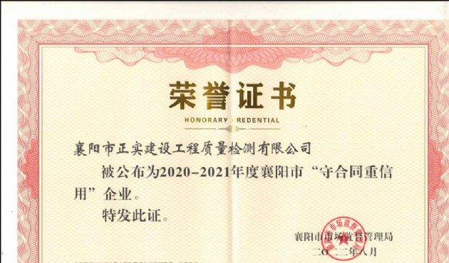 近期,襄阳市市场监督管理局正式发布了2020-2021年度襄阳市“守合同重信用企业”名单,正实检测公司凭借着以诚取信、以