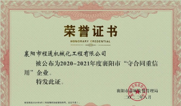 近日,襄阳市市场监督管理局正式公布了2020—2021年襄阳市守合同重信用企业名单,程通机械化工程有限公司秉承依法经营、诚信