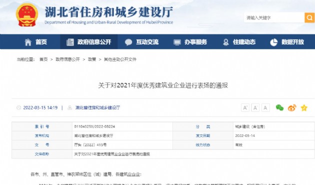 为充分发挥优秀建筑业企业在湖北省建筑行业的典型示范引领作用,3月14日,湖北省住房和城乡建设厅公布2021年度湖北省优秀建筑业企