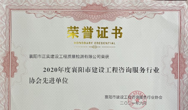 6月21日,正实检测公司荣获“2020年度襄阳市建设工程咨询服务行业协会先进单位”。此次“先进单位”的评选是
