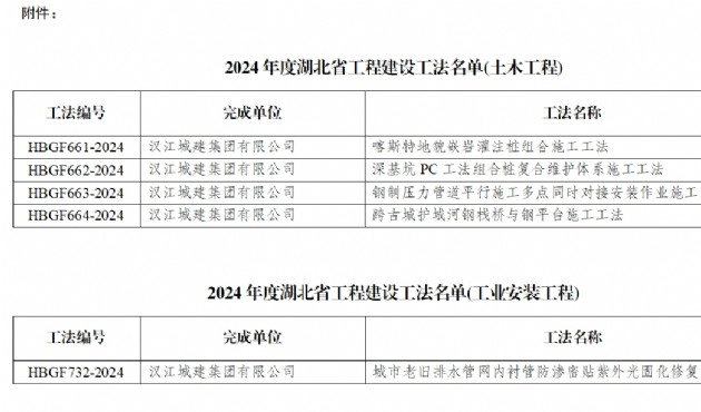 近日,湖北省住房和城乡建设厅发布2024年度湖北省工程建设工法公告,由汉江城建申报的《喀斯特地貌嵌岩灌注桩组合施工工法》《深