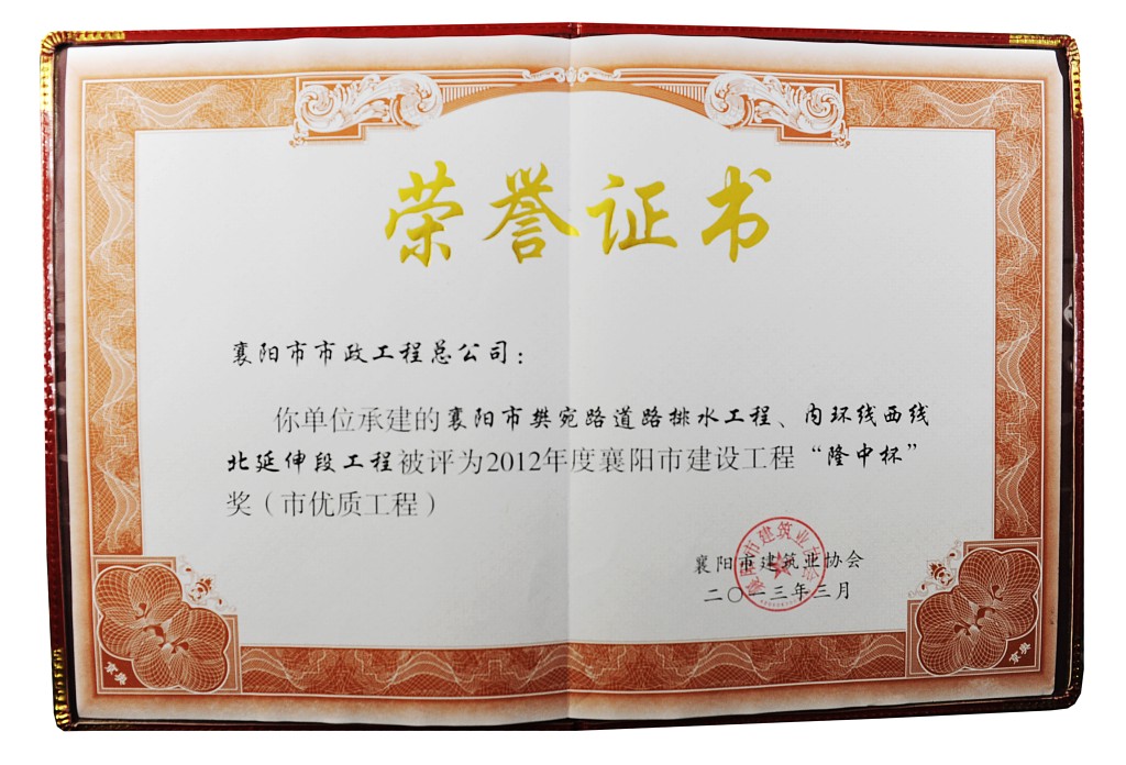 2012樊宛路工程襄阳市“隆中杯”证书