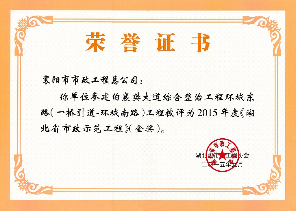 2015襄樊大道环城东路综合整理湖北省示范工程金奖