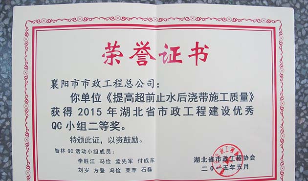 2015超前止水后浇带施工质量湖北省优秀QC二等奖