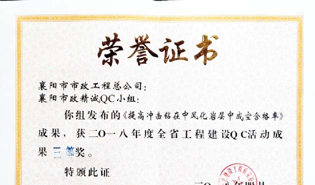 2018年“提高冲击钻在中风化岩层中成空合格率”全省工程建设QC活动成果三等奖