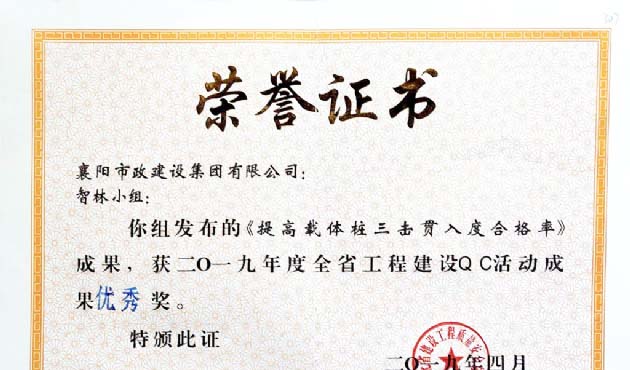 2019年“提高载体桩三击贯入度合格率”全省工程建设QC活动成果优秀奖